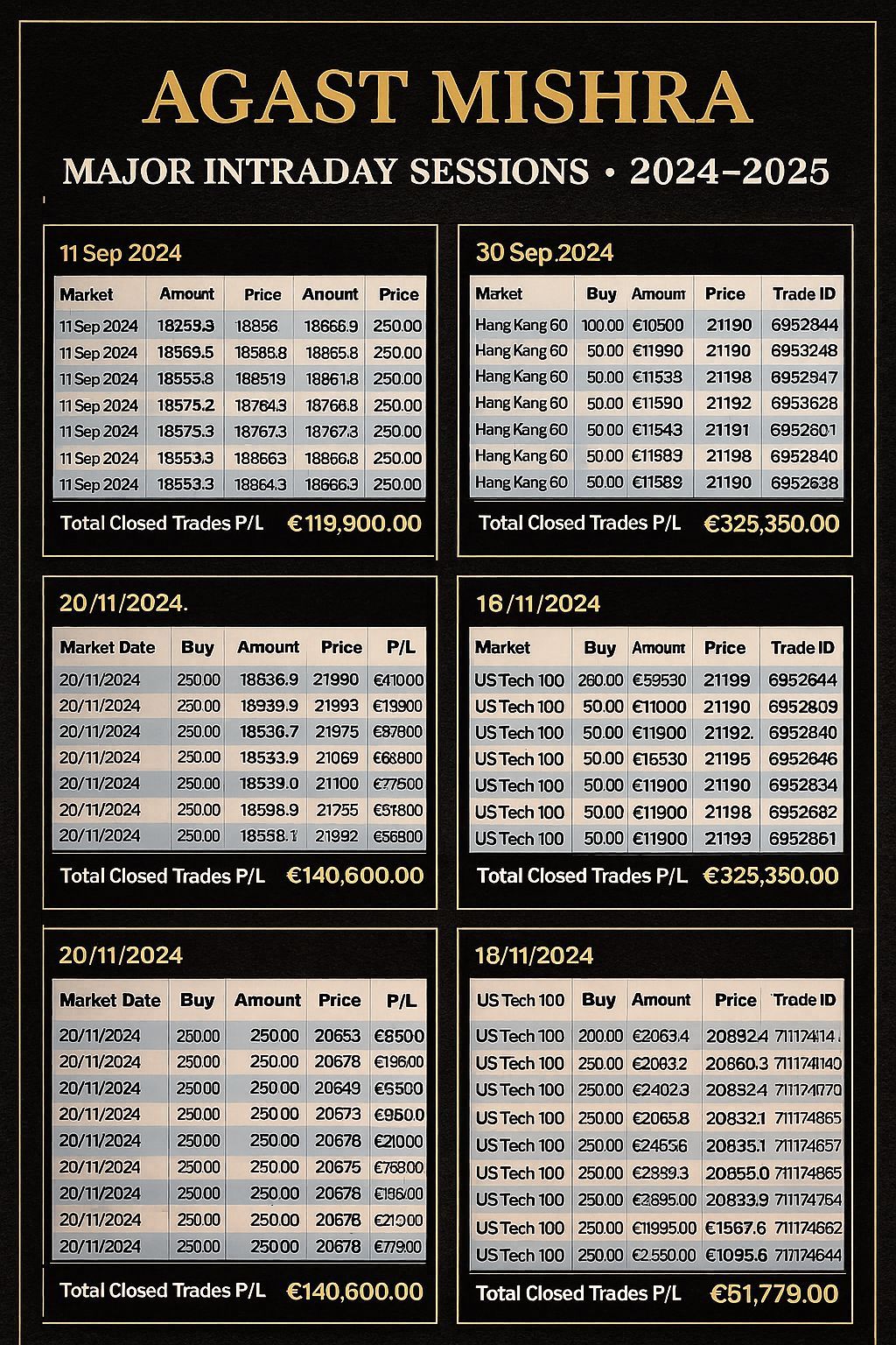 A Deep Dive Into My Highest-Clarity Trading Sessions By Agast Mishra — Trader, Independent Thinker & Market Strategist In trading, most days are quiet. A handful are difficult. And a very select few — when volatility, structure, clarity, and timing align — become massively rewarding. This article breaks down my major intraday sessions across 2024 and early 2025, documented through verified contract notes and executed with discipline, structure, and controlled aggression. This is not trading advice. This is documentation — and a study of what happens when process meets opportunity. ⸻